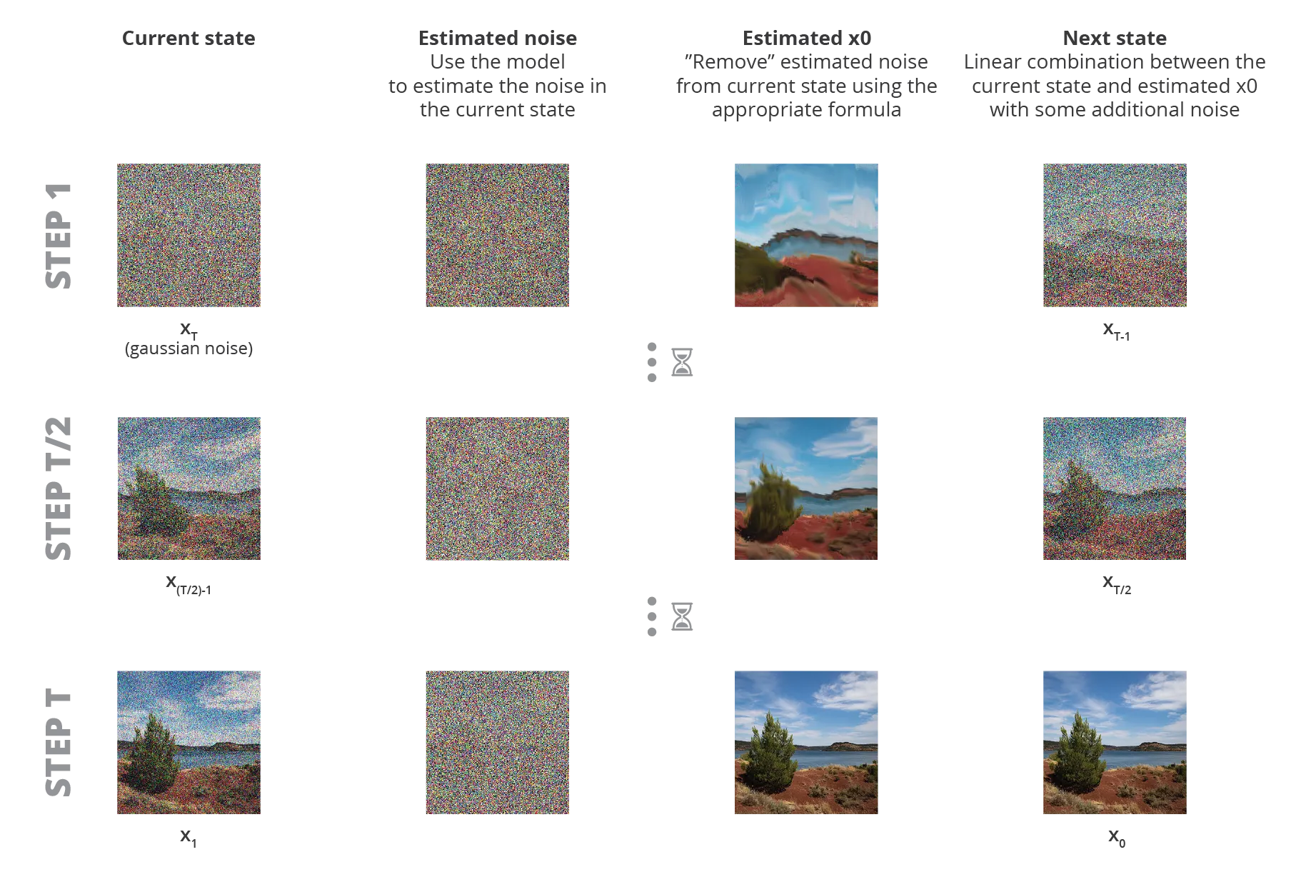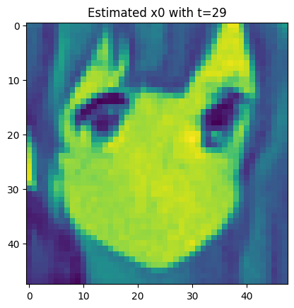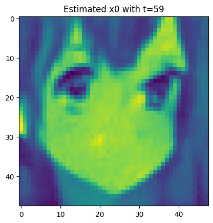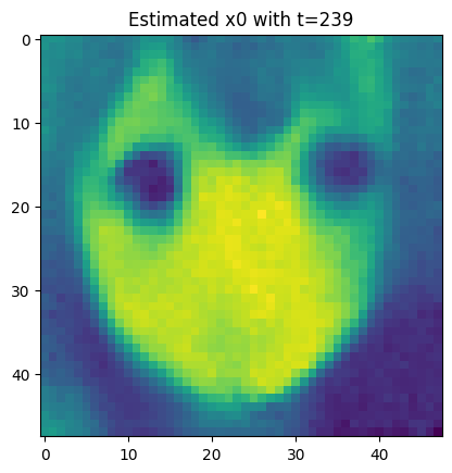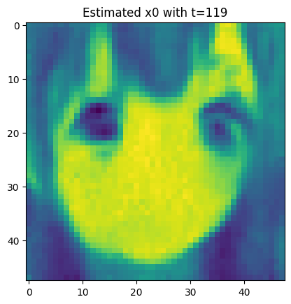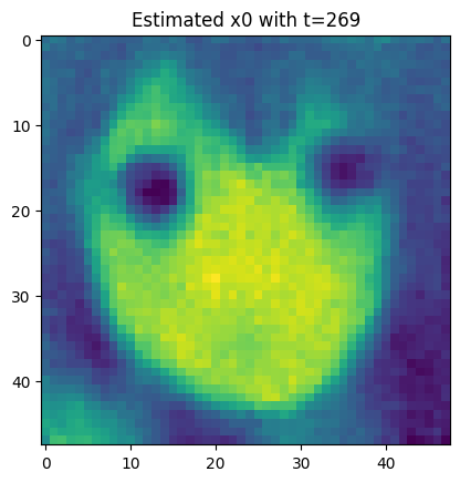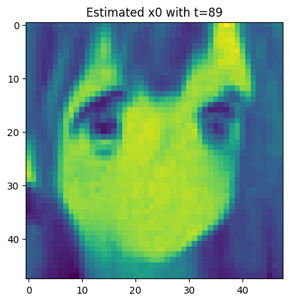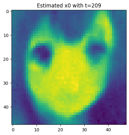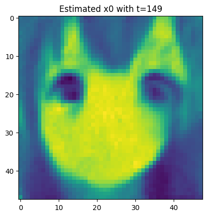 For each t, we let \color{blue}{\widehat{x}_0=\widehat{x}_0(x_t,t)} s.t. \begin{aligned} x_t = \sqrt{\overline{\alpha}_t} {\color{blue}{\widehat{x}_0}} + \sqrt{1-\overline{\alpha}_t} {\color{red}{\varepsilon_{\theta}(x_t,t)}}, \end{aligned} where {\color{red}{\varepsilon_{\theta}}} is our model to predict the {\color{red}{\textbf{real noise }\overline{\varepsilon}_t}} by giving x_t,t.